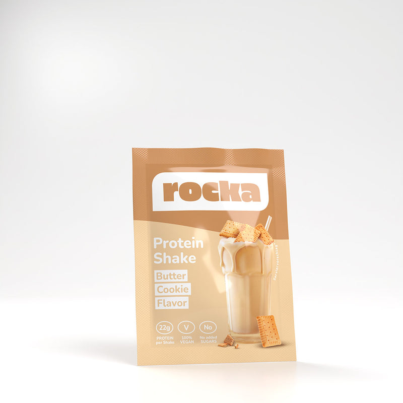 Veganes Mehrkomponentenproteinkonzentrat mit Butterkeks-Geschmack mit Süßungsmitteln zur Zubereitung eines Proteinshakes.